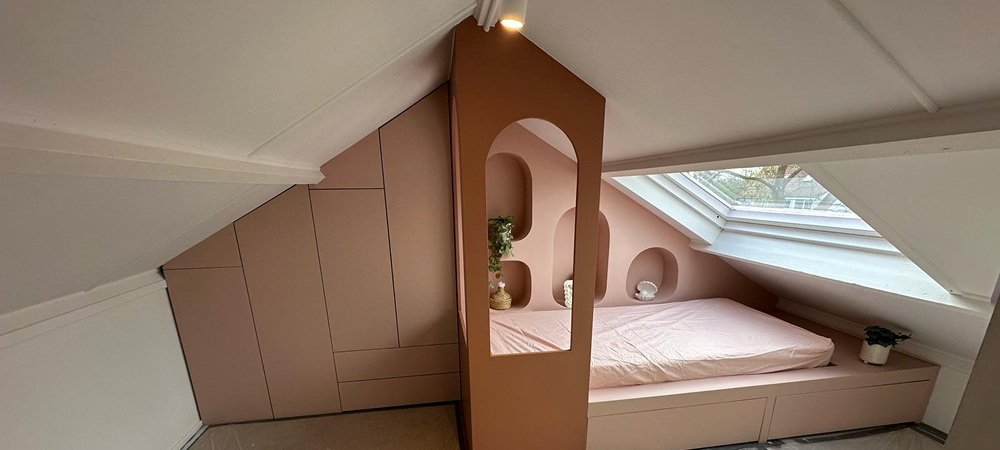 Project voor het individuele ontwerp en de realisatie van maatwerkmeubilair op de derde verdieping van een privéwoning in Bergen, uitgevoerd binnen 4 dagen. Het project omvatte het ontwerp, de productie en de installatie van een kast, wandplank en bed, volledig afgestemd op de afmetingen van de ruimte en de wensen van de opdrachtgever. Bijzondere aandacht werd besteed aan functionaliteit, ergonomie en visuele samenhang, zodat alle meubelstukken één geheel vormen binnen het interieur. Door het gebruik van maatwerkoplossingen werd de beschikbare ruimte optimaal benut en ontstond een praktisch en esthetisch uitgebalanceerd resultaat. Het eindresultaat is een comfortabele en goed georganiseerde leefruimte met meubelstukken die naadloos aansluiten op het interieur en de architectuur van de woning.